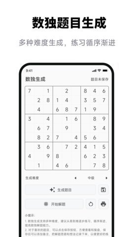 3、数独题目生成功能支持多种难度选择,从入门到精通,满足不同用户的需求。