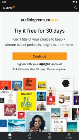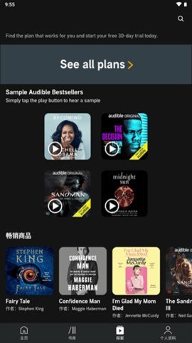 4、据Audible声称,他们拥有百万本名著、畅销书等作品,用户可以在这里找到各种语言和类别的有声书,包括英文原版书,满足不同用户的阅读兴趣和学习需求。