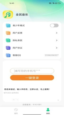 2、用户还可以通过填写手机号码,点击“一键登录”来快速登录,便捷使用全民音乐播放器。