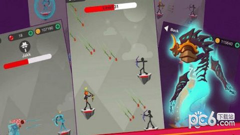 1、玩家可以控制火柴人通过拉弓射箭消灭敌人来获得金币和材料。
