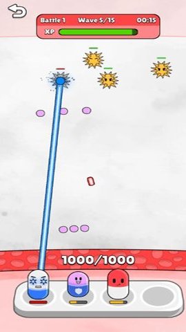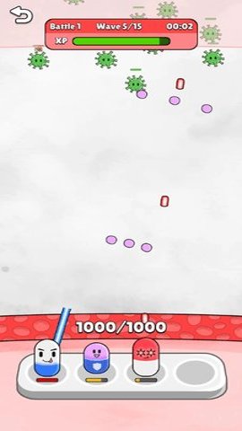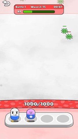 1、玩法简单,玩家通过点击屏幕来建造和升级药丸堡垒,提升防御能力,抵御更多病毒的入侵。
