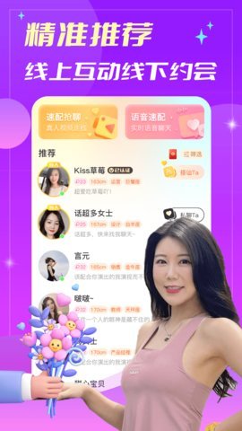 2、系统会根据用户资料和偏好推荐合适的交友对象,用户只需一键操作即可进入搭讪环节,快速建立。