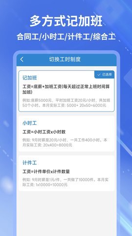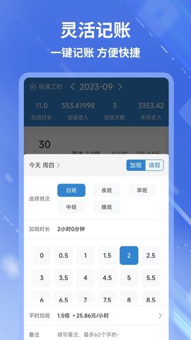 2、特别针对采用综合工时制度的工设计,开心记加班是一款高效的薪资管理工具。