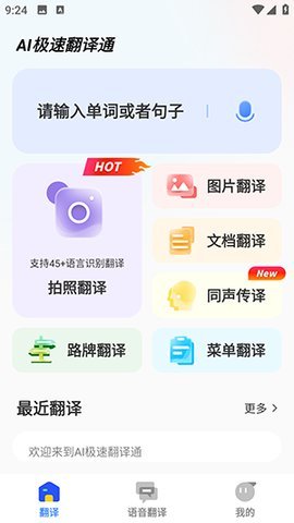 AI极速翻译通是一款集成了先进人工智能技术的翻译应用,不仅支持韩语翻译和词典翻译,还提供词典·翻译应用,让用户无需联网也能使用部分翻译功能,方便在没有网络的情况下进行翻译。 这款应用支持多种翻译方式,包括拍照翻译、图片翻译、文档翻译、语音翻译等,满足用户在不同场景下的翻译需求。采用先进的人工智能技术,确保翻译结果的准确性和效率。
