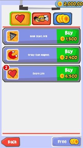 疯人掉落是一款轻松休闲类游戏,属于单机益智休闲游戏,玩家在游戏中可以享受到趣味休闲的乐趣。系统为玩家提供了三种道具供玩家购买使用,分别是钻头、磁铁和爱心。钻头道具的价格为2400金币,使用后可以无视地形,让玩家持续下落,是性价比较高的道具。