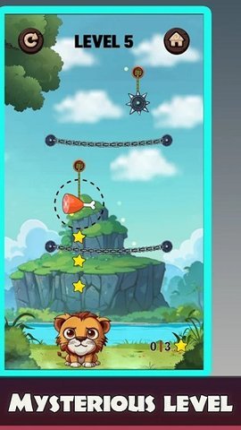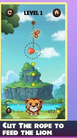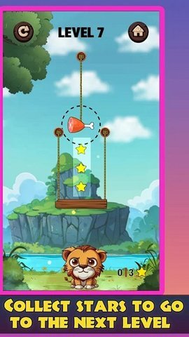 2、玩家需要观察并思考割断绳子,让肉掉入狮子口中,并收集星星。