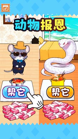 2、动物来报恩游戏的画面精美细致,动物形象栩栩如生,场景设计独具匠心,让玩家仿佛置身于一个充满童话色彩的世界中。