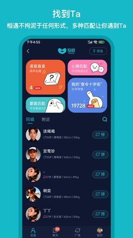 2、作为一款备受广大用户喜爱的综合性交友软件,互逗不仅能满足用户拓展社交圈子的需求,还能给用户带来许多意想不到的惊喜和乐趣。