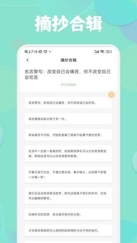 3、海量精选文案金句和阅读文章满足了用户多样化的阅读需求,而且阅读资源丰富且质量高,为用户提供精选的阅读摘抄和推荐。