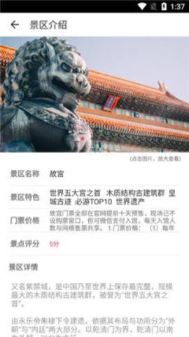 2、您可以通过掌上景点app快速了解景点的地理位置、评分数据等信息,为您的出行提供指导,让旅行变得更加简单轻松。