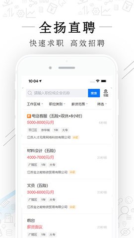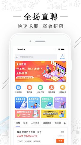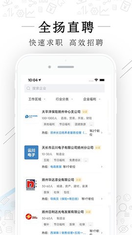 4、全扬直聘APP是一款功能强大、服务全面的求职招聘软件,专注于扬州本地招聘市场。