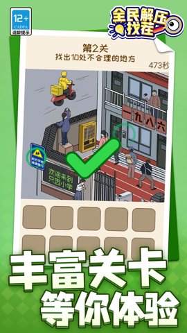 1、全民解压找茬拥有多样化的场景风格和故事背景,每一关都设计独特,让玩家在不同的场景中感受到不同的挑战和乐趣。