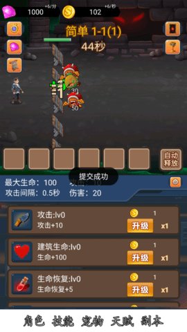 2、玩家在游戏中可以体验地牢风格的放置挂机闯关游戏,在怪兽施虐星球上坚守城墙,阻止怪兽逾越城墙的进攻。