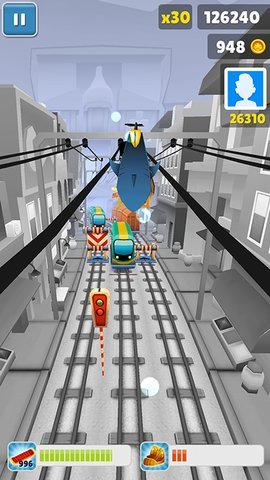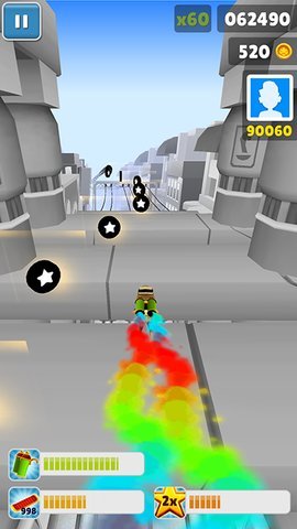 3、闪电般快速猛击特技,地铁冲浪道具如气垫滑板提供一个无敌的护照,使玩家一定内不受任何伤害,特别有用。