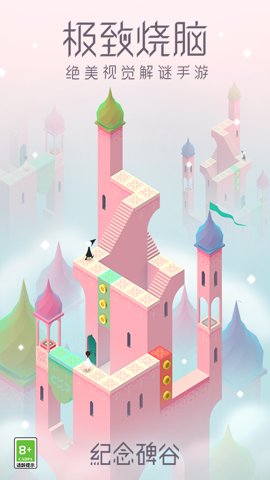 纪念碑谷是一款融合休闲益智和解谜元素的游戏,被誉为艺术品级解谜游戏的典范。游戏以神奇建筑和奇妙几何体为背景,配以神秘而清新的画面以及宁静悠远的音乐,构建了一个充满奇幻色彩的纪念碑迷宫。 玩家需要通过利用视觉错觉、几何体重构和躲避障碍的方法来帮助沉默公主艾达走出纪念碑迷宫。