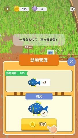 3、解锁不同的鱼类,购买鱼苗来增加鱼塘内的鱼类种类。