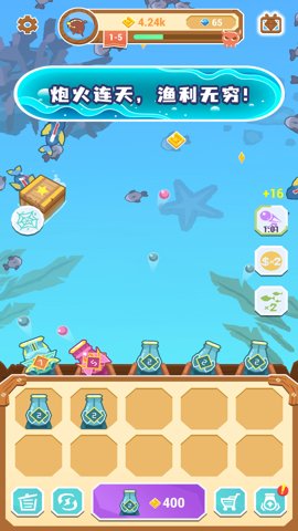 3、不同种类的鱼儿在水中游动,有的色彩斑斓,有的形态奇特,玩家需要灵活运用大炮,捕捉这些美丽的海洋生物。
