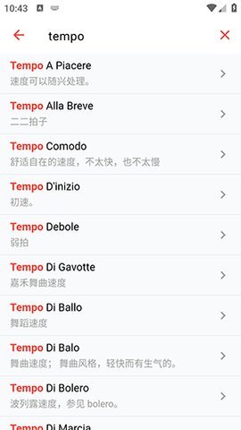 3、该应用收录了近20000个音乐术语,并支持中文及英语的模糊检索,帮助用户迅速找到所需的乐曲词汇。