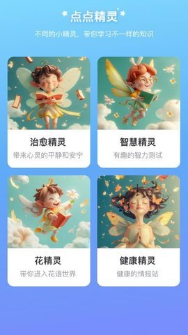 4、点点小精灵APP是一款集治愈、智慧、花语和花语解梦于一体的多功能软件,旨在为用户提供全方位的身心放松和知识增长体验。