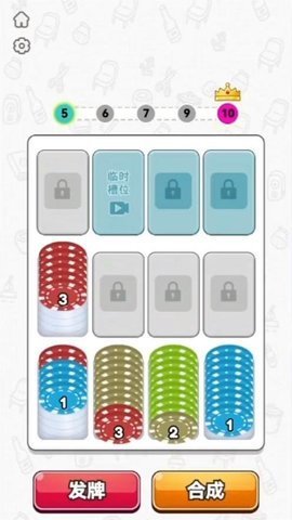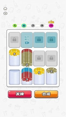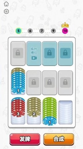 2、游戏界面会出现多种颜色的硬币散落在槽位上,玩家需要通过点击操作,将相同颜色的硬币聚集到一起,并合理合成,以达成目标。