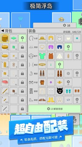 极简浮岛是一款沙盒建造游戏,是一款沙盒冒险类手游游戏。在这个没有美术支援,玩家只能用简单的几何图形拼一拼,传达基本的意会。游戏中的装备穿戴也十分自由,披风可以穿到背部,衣服穿在躯干上,裤子则穿在腿部。