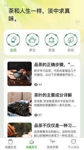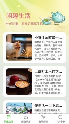 1、这款应用功能全面、内容丰富,为用户提供了一个便捷的平台,让用户在享受慢生活的能够学习到各类生活小知识和茶艺文化。