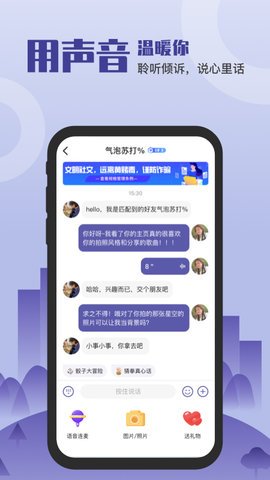 1、软件提供了多种破冰玩法和“温暖陪伴”功能,帮助用户快速打破陌生感,找到心灵上的慰藉和陪伴。