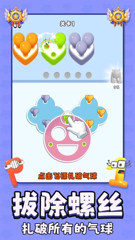 神奇气球是一款集消除、解谜、益智于一体的游戏,玩家需要按照正确的顺序拆下探针来戳破相应颜色的气球以完成关卡。这款游戏不仅拥有大量的关卡和多种不同的游戏模式,还能让玩家在游戏中体验到解谜和消除的乐趣,享受解压的游戏玩法。 除了气球消除的玩法外,游戏中还设有极具挑战性的扭螺丝游戏。