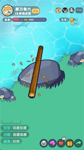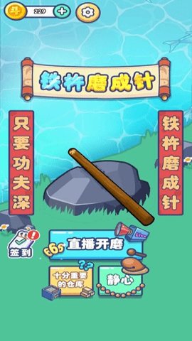 2、河边磨个针游戏是一款考验玩家耐心的磨针游戏,拥有众多关卡,每一关都需要玩家将铁杵磨成针才能过关。