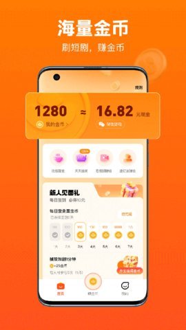 3、这款应用还提供赚钱功能,用户可以通过观看、完成任务和邀请好友获得金币奖励,提升用户参与度。
