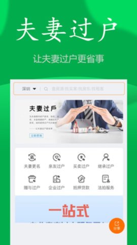 2、这款租房app由飞布找房(深圳)科技有限推出,提供全国范围内的房产过户代办服务,涵盖了房产继承、夫妻更名、离婚房产过户、房产买卖、亲属赠与、房产过户、房屋抵押贷款、法拍房等各种交易服务。