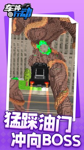 车神行动是一款益智游戏,玩家将驾驶着一辆车在赛道上飞驰。在赛道的终点,玩家将面对庞大的怪兽,需要利用汽车高速撞击怪兽,不断冲撞并积累对怪兽造成的伤害,直到将怪兽摧毁,赢得关卡的胜利。玩家还能通过对怪兽造成伤害来赚取收益,用于提升车辆的性能,包括破坏力和杀伤力。