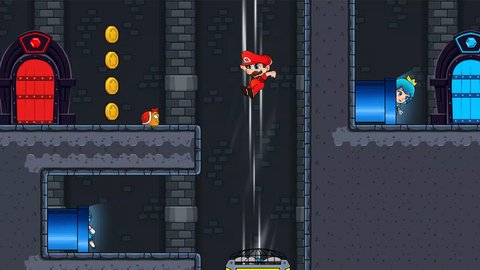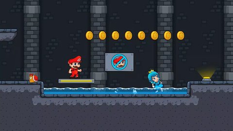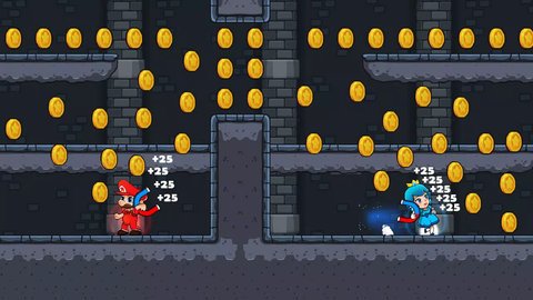 4、游戏的两个角色分别类似于马里奥和库巴公主,玩家需要控制他们克服游戏中的障碍,收集宝石并到达出口。