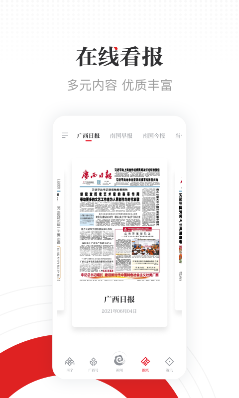 2. **多元化资讯整合**:通过整合广西日报传媒集团旗下的多家媒体资源,广西云APP不仅提供本地新闻,还涵盖了科技、财经、社会、国际等多个领域的资讯,用户可以轻松浏览不同类型的新闻,满足各类信息需求。