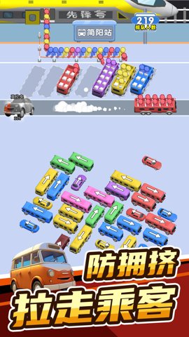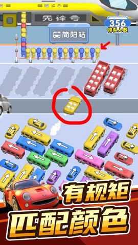 2、玩家需要控制各种不同颜色的车辆,帮助小人顺利上车。