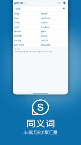 2、用户可以在几种语言中查找同义词、同类词和定义,收藏夹列表和搜索历史也可以在脱机状态下使用。