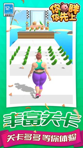 你胖你先上是一款益智游戏,玩家需要在游戏中通过不同关卡的跑道上吃掉各种食物,而不同食物的热量会对玩家的角色产生不同的影响。吃低热量的食物会使角色变瘦,而吃高热量的食物则会使角色变胖。玩家需要根据食物的热量来做出选择,以保持角色的体型在适当的范围内。