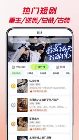 2、该应用界面友好,设计简洁明了,让用户可以轻松上手,展示热门短剧排行榜,帮助用户发现更多优质内容。