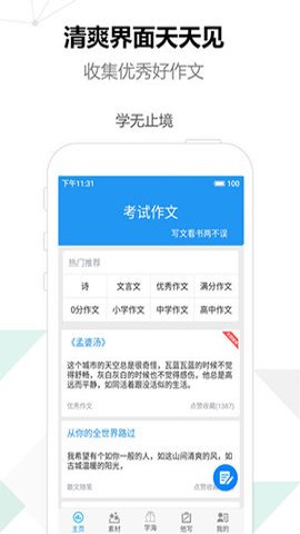 1、根据用户的学习阶段和写作水平,智能推送适合的作文素材和题目,帮助学生更好地提升考试作文水平。