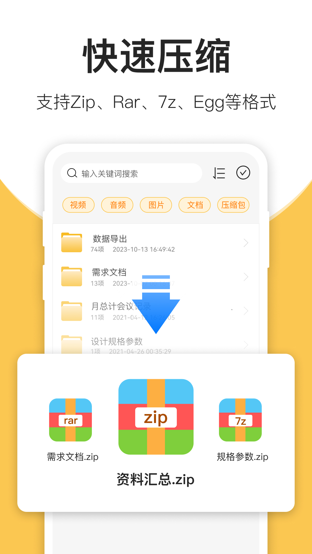 压缩宝解压是一款专为移动设备设计的压缩与解压缩工具,支持多种常见的压缩格式,如Zip、RAR、7z等。用户可以通过这款软件轻松地将多个文件打包成一个压缩文件,从而节省存储空间并便于传输。软件还提供了文件加密功能,用户可以为压缩包设置密码,确保文件的安全性。压缩宝解压还具备文件管理、分享等多种实用功能,帮助用户更好地组织和使用文件。
