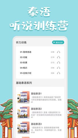 2、基础泰语板块则提供了详细的泰语语音全套课程,用户可以进行语音跟读,优化泰语口语能力。