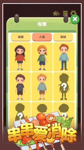 1、在串串爱消除中,玩家需要点击收集按钮来了解需要收集的场景、客人、食材等内容,解锁这些元素才能进行更加具有挑战性的闯关任务。