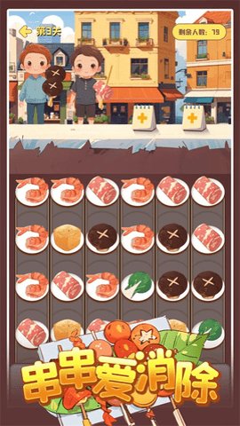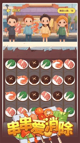 3、串串爱消除是一款美食消除闯关游戏,玩家需要通过点击食材来进行消除挑战,将三个相同的食材穿成串来消除。