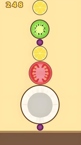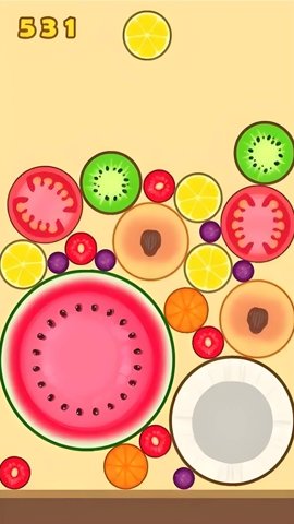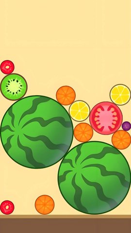 1、当两个葡萄落在一起时,它们会神奇地合成一颗樱桃;再加入一颗樱桃,便会变成橘子;而最终的目标是合成一个巨大的西瓜,让玩家在不断消除水果的过程中享受到成就感和乐趣。