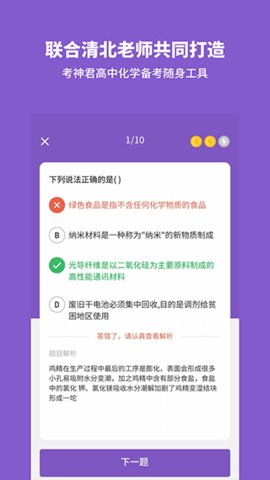 1、通过针对性复习和闯关模式,考神君高中化学涵盖了各地考试题型,帮助学生全面复习。