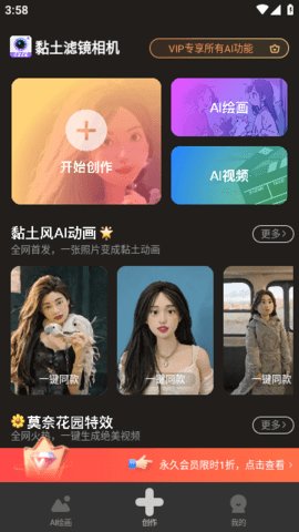 2、黏土滤镜相机还具有AI智能创意玩法,包括粘土风格拯救废片和热门AI视频功能,可以帮助用户引爆社交圈流量密码。