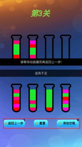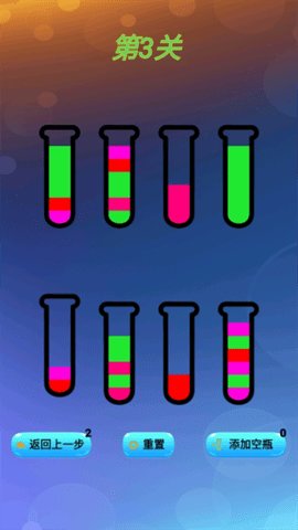 3、在v0版本中,玩家只需根据给出的瓶子和水的颜色,将不同颜色的水倒入不同杯子中,完成任务即可。