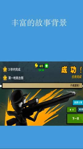 3、炽热狙击手是一款充满挑战和乐趣的飞行射击游戏,火柴人狙击手的经典角色再次回归,带给玩家全新的游戏体验和乐趣。