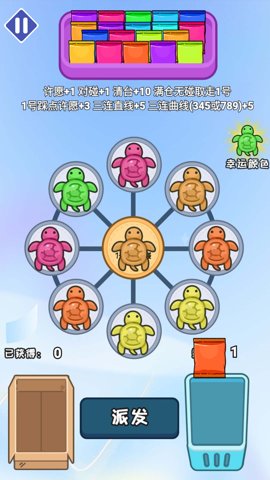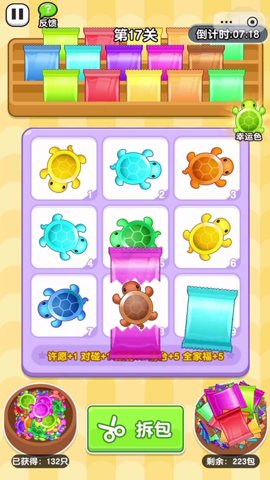 1、玩家需要不断地观察屏幕上出现的乌龟,找出相同颜色的乌龟进行对碰消除。