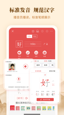 在内容特色方面,新华字典提供了智能查检和扫码查字功能。特邀新闻联播原著名主播李瑞英播读汉字,支持即时跟读对比,帮助用户学习标准汉字发音。还提供了辨析、近义词、反义词、接龙、组词、笔顺、部首等智能助手问答服务,帮助用户更好地理解和运用汉字。新华字典融合了多部权威字典和词典,用户可以通过扫描纸书正文二维码,跳转至当页收字列表,获取字的发音、笔顺动画、知识讲解等内容。用户可以像翻阅纸书一样,在App中翻阅新华字典现代汉语词典,也可以一框式检索,方便快捷地查找需要的信息。